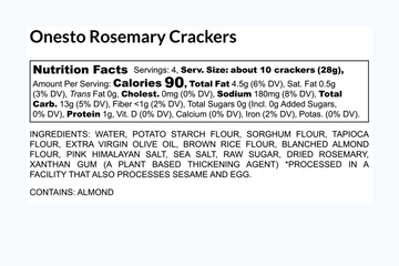 Onesto's Rosemary Crackers transport you to an Italian Tuscan countryside in just one bite. The flavors in our warm, woodsy and earthy Rosemary are perfect on any antipasti platter filled with bold cheeses, cured meats and roasted veggies.
